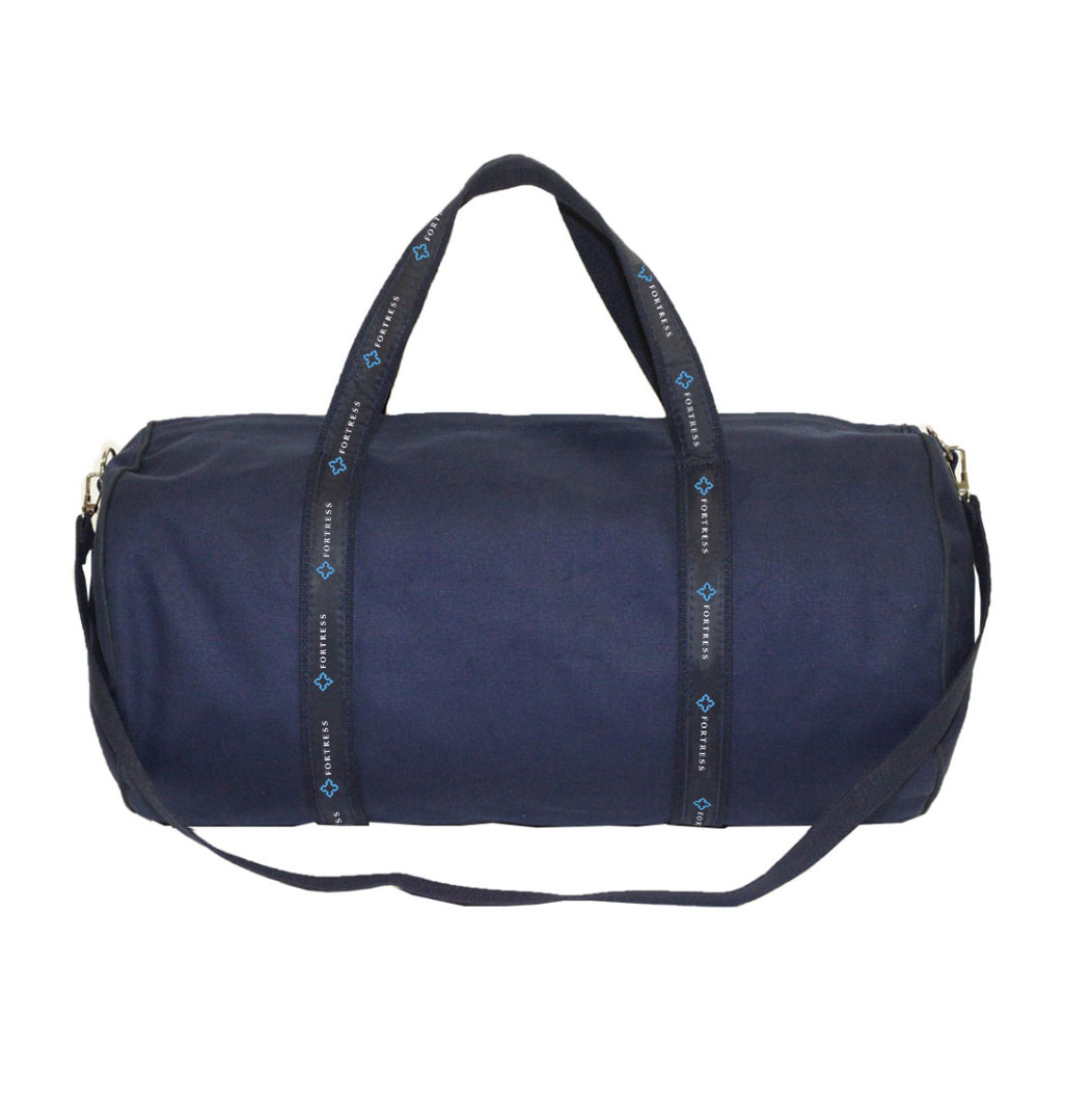 The Original Banker Bag, with its barrel design and removable shoulder strap, takes you through your busy day in comfort and style. Navy canvas with navy webbing and navy ribbon. Features your logo ribbon on the handles. Dimensions: 21"L x 11"H x 11"D. Designed and manufactured in the USA exclusively by Scarborough & Tweed.