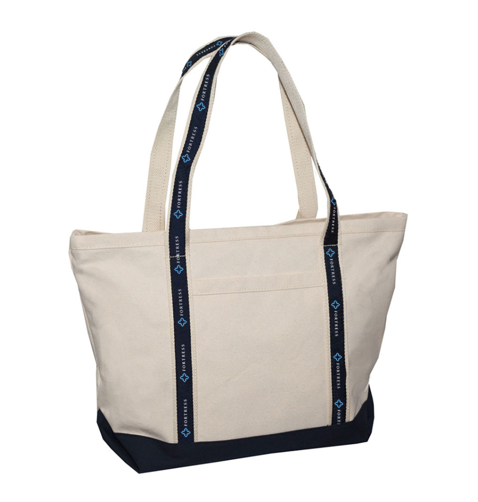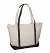 Natural canvas boat bag with navy trim, zippered top and exterior pocket. Features your logo ribbon on the handles. Designed and manufactured in the USA exclusively by Scarborough & Tweed. 19" W x 14" H X 5" D